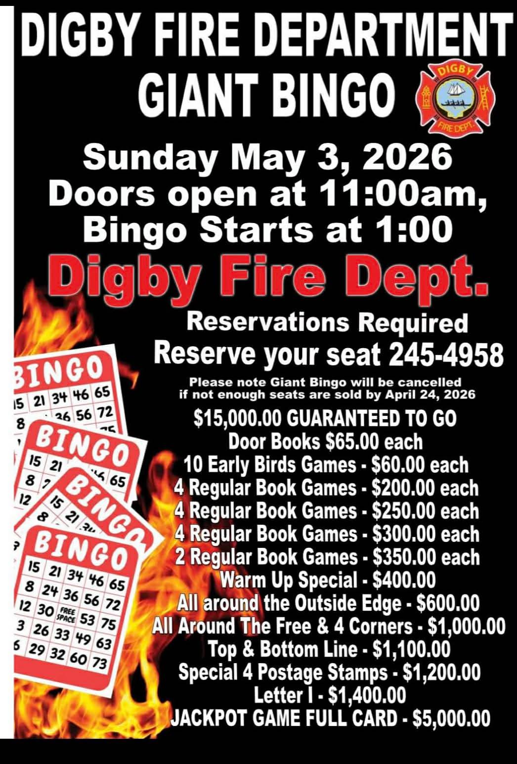 The Digby Fire Department is hosting their Giant Bingo on May 3rd!!