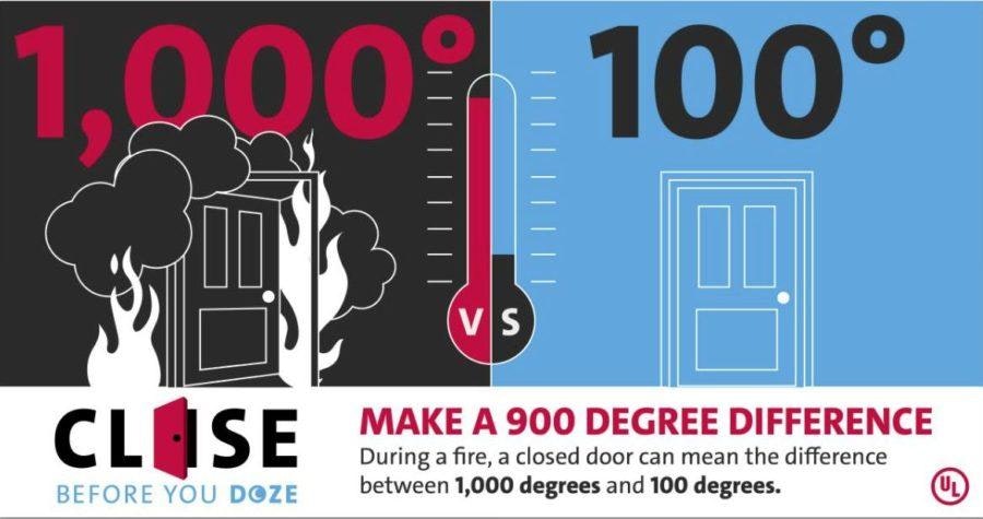 “MAKE A 900 DEGREE DIFFERENCE – During a fire, a closed door can mean the difference between 1,000 degrees and 100 degrees.” Close before you doze campaign.