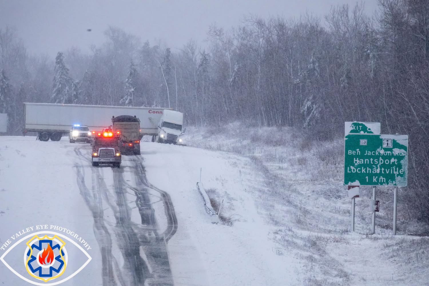 This photo was taken late this morning of a jack-knifed tractor trailer on the Avonport Mountain along Highway 101.
