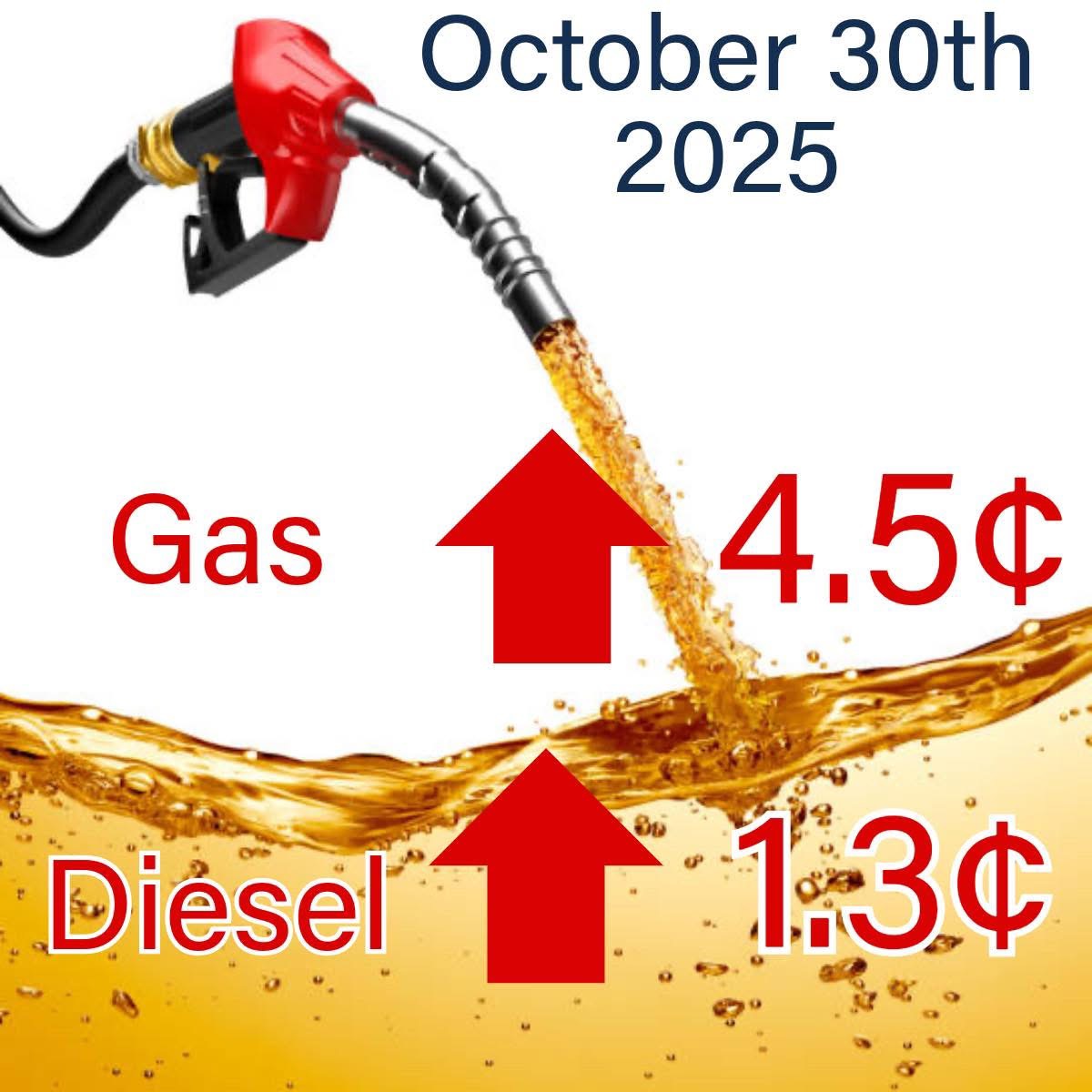 Gas up 4.5 and diesel up 1.3 at midnight...