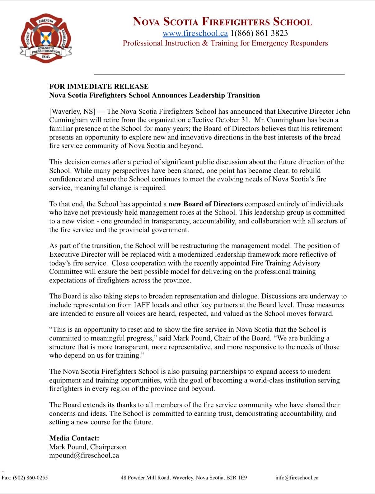 FOR IMMEDIATE RELEASE: EXECUTIVE DIRECTOR & BOARD OF DIRECTORS CHANGE Nova Scotia Firefighters School Announces...