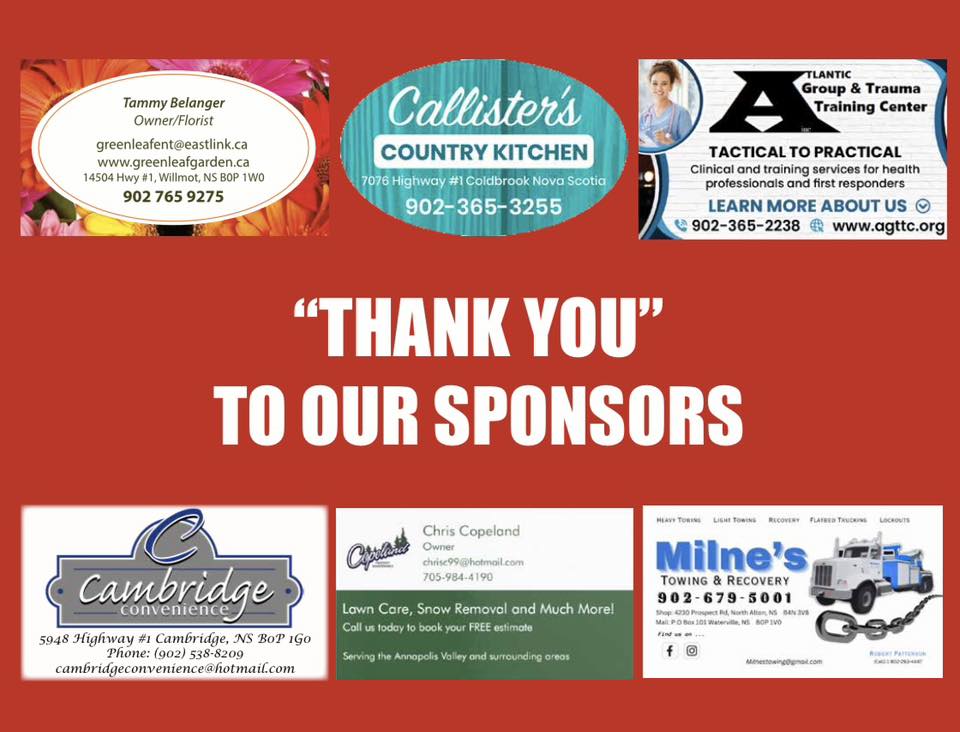 Thank you to Cambridge Convenience, Milne’s Towing & Recovery, Green Leaf Enterprises, Callister’s Country Kitchen, Copeland Property Maintenance, Atlantic Group & Trauma Training Center & Keystone Monument and Granite Products.